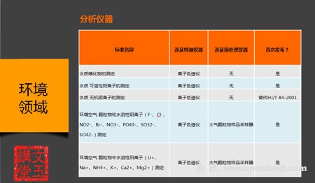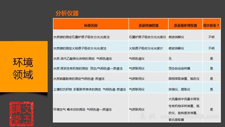 针对环境领域标准所对应的仪器,文玉老师又为大家整理了以下表格: